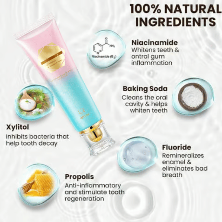 • 🌟 Niacinamide (Vitamin B3): Helps whiten teeth by inhibiting melanin production, reduces inflammation, and promotes healthier gums.