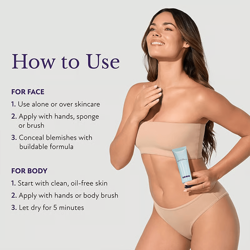 Body Application: Start with clean, dry, and oil-free skin to ensure the best transfer-resistance. Squeeze a liberal amount of product onto the area you'd like to perfect and gently blend in an upward and outward motion. Apply additional layers for more coverage, letting each dry for 60 seconds. For best transfer-resistance, let the product dry down completely for at least 10 minutes then remove excess by patting the area with a mitt or paper towel. ( Like blotting your lipstick!)